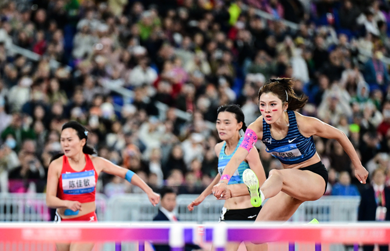 11月19日,四川队选手吴艳妮(右)在比赛中。她获得亚军。\n 当日,第十五届全国运动会田径项目女子100米栏决赛在广州举行。\n 新华社记者 江汉 摄