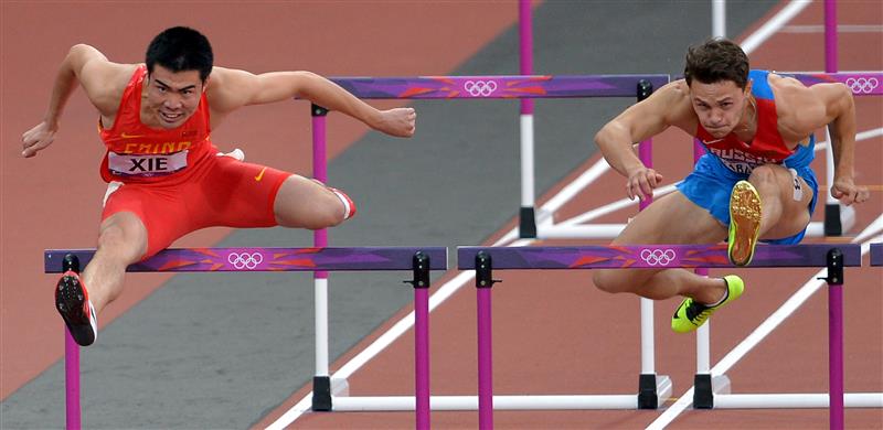 新华社照片,伦敦,2012年8月8日,中国选手谢文骏(左)在比赛中。 当日,在2012年伦敦奥运会男子110米栏半决赛中,中国选手谢文骏以13秒34的成绩位列第九,无缘决赛。 新华社记者陈晓伟摄
