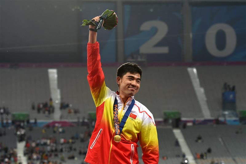 2014年10月1日,冠军中国选手谢文骏在颁奖仪式上。当日,2014仁川亚运会田径男子110米栏颁奖仪式举行。\n 新华社记者公磊摄