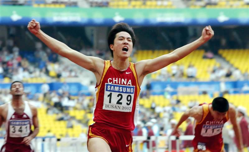 图为2002年10月9日,釜山亚运会,首次参加亚运会的刘翔以13秒27的成绩问鼎冠军。\n 新华社记者杨磊摄