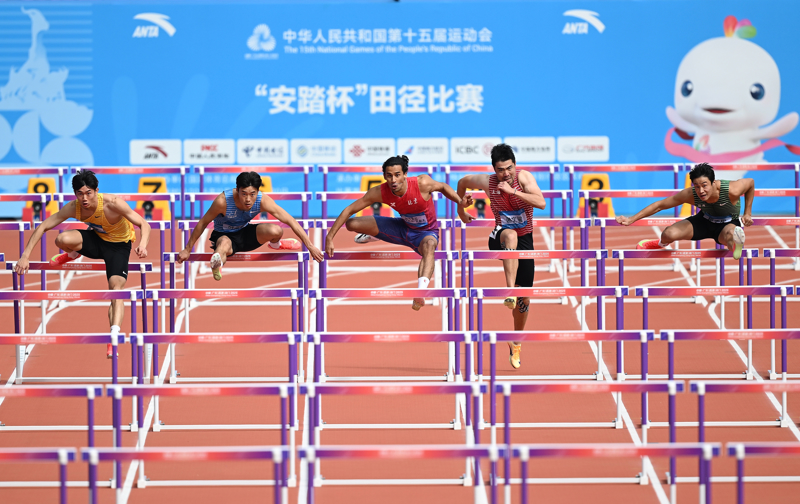 11月19日,参赛选手在比赛中。\n 当日,第十五届全国运动会田径项目男子110米栏预赛在广州举行,谢文骏(右二)在比赛中。\n 新华社记者 邓华 摄