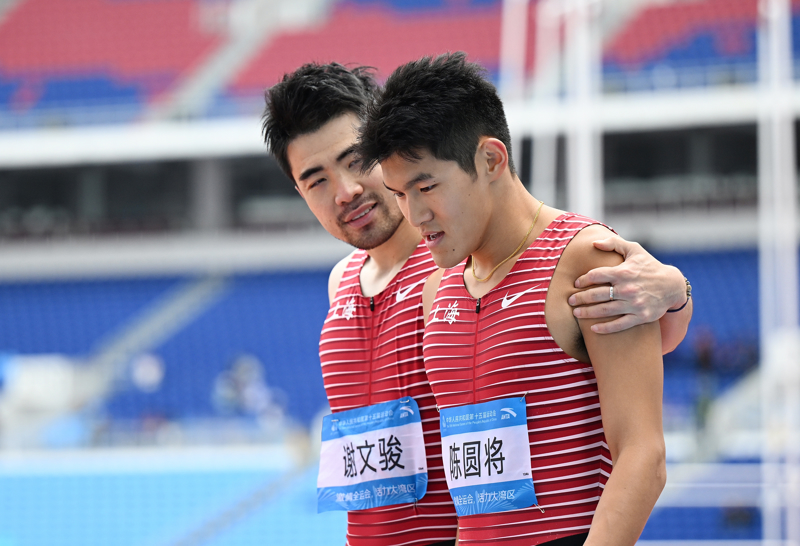 11月19日,上海队选手谢文骏(左)和陈圆将在比赛后。 当日,第十五届全国运动会田径项目男子110米栏预赛在广州举行。 新华社记者 周牧 摄
