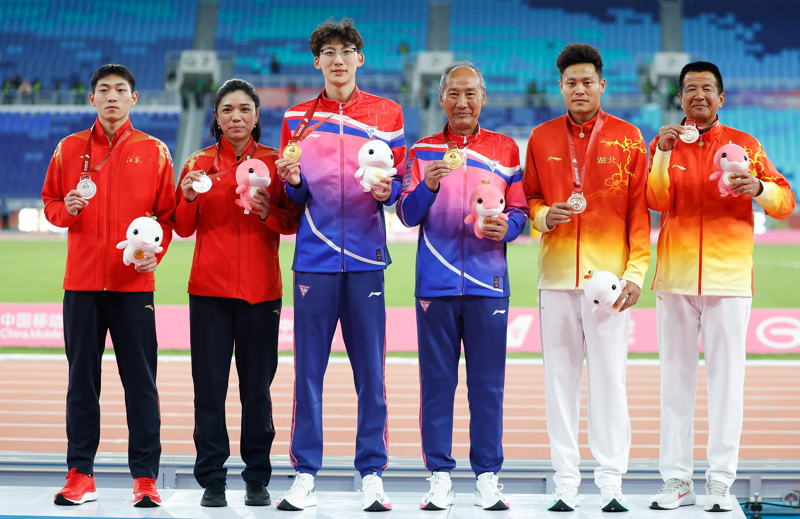 11月19日,获得冠军的上海队选手徐卓一(左三)、获得亚军的江苏队选手刘俊茜(左一)、获得季军的湖北队选手朱胜龙(右二)在颁奖仪式上与教练合影。\n 当日,第十五届全国运动会田径项目男子110米栏决赛在广州举行。\n 新华社记者 黄伟 摄